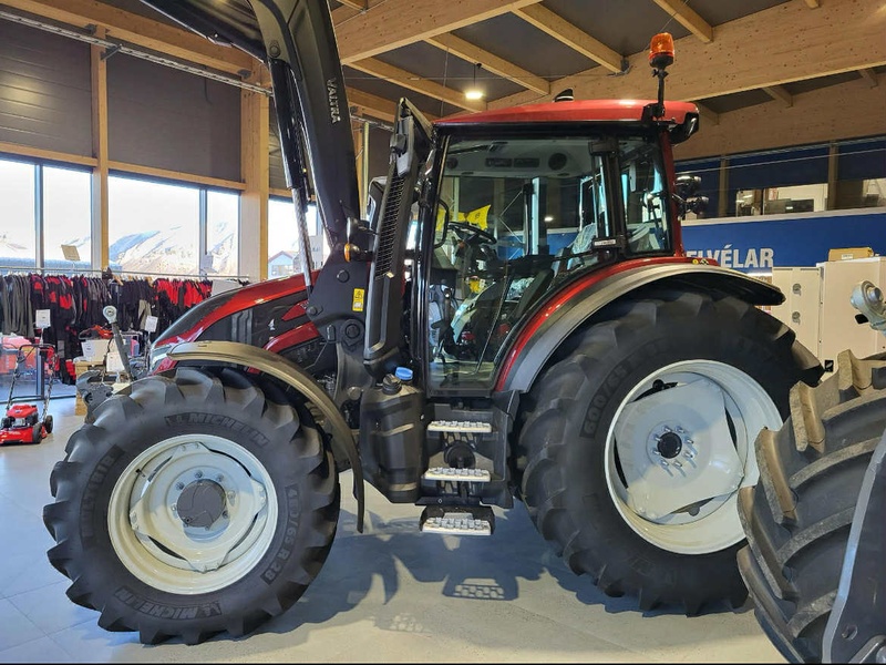 Vél og drifbúnaðar Mótor: 4,4 L Agco Power (4 cyl), 135 hö / 550 Nm (Boost: 145 hö / 560 Nm í B5+ gír og PTO vinnslu). Búnaður: Vélarblokkarhitari og vatnsskilja. Skipting: Versu (4 gírar + 6 milligírar) með skriðgír. Kúplingsfrír vendigír, „Brake to Neutral“ virkni og rafskipting í sætisarmi. Hraði: 43 km/klst við 1640 snú/mín (EcoSpeed). Hásingar: Fjaðrandi framhásing, 100% driflæsing á báðum hásingum og sveigjanleg frambretti. Ökumannshús og stjórntæki Hús: Hljóðeinangrað með húsfjöðrun, Metallic rauður litur, hurðir báðum megin og „High visibility“ þakgluggi. Þægindi: Loftfjaðrað sæti, bólstrað farþegasæti, útvarp, tvöföld miðstöð og loftkæling. Stjórnun: SmartTouch skjár og fjölnotastýripinni (joystick) í sætisarmi. Ljós: Premium vinnuljósapakki (framan/aftan/handrið/bretti) og gult snúningsljós. Vökvakerfi og tengingar Afköst: Load Sensing kerfi (110 L dæla) með sjálfvirkri vökvaaðstoð og 1" bakflæði. Úttök: 4 tvívirk rafstýrð úttök aftan (stýrt í SmartTouch). Tengi: ISOBUS, ISO 11786 upplýsingatengi og straumúttök. Lyfta/Aflúttak: 3ja hraða PTO (540/540E/1000) með utanáliggjandi rofum. Framlyfta, framaflúttak og 1 par vökvaúttaka framan. Dráttarbúnaður: Lyftutengdur krókur með vökvaútskoti, vökvavagnbremsuventill (2-línu) og ABS tengi. Annað Öryggi: 6 kg slökkvitæki. Fyrsta skráning 18.11.2024 Þjónusta: Valtra Connect í 5 ár innifalið. ATH öll lýsingin komst ekki fyrir svo endilega hafa samband fyrir frekari upplysingar um vélina